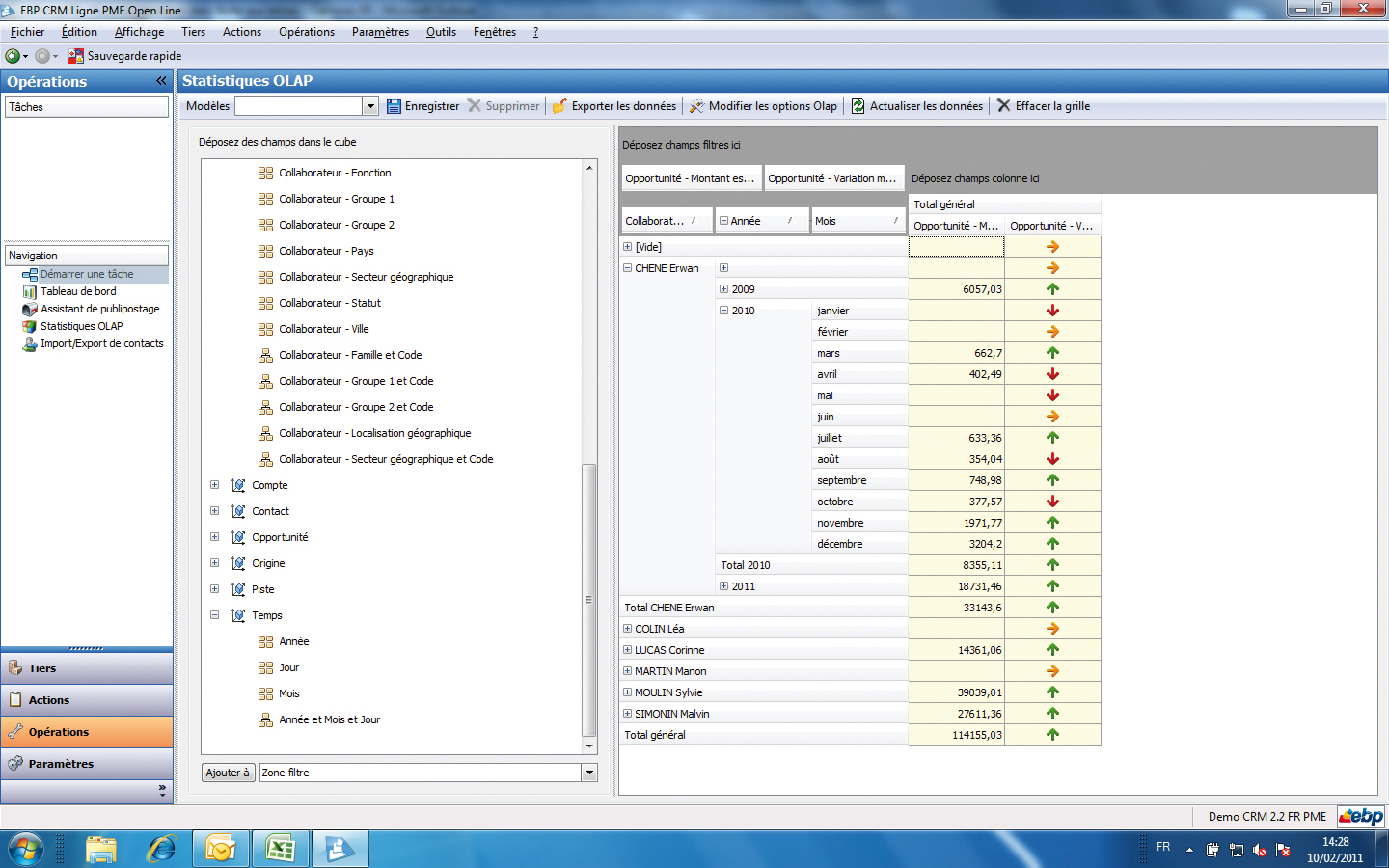 - Mesurez l’efficacité de vos collaborateurs : la qualification des contacts, les activités en cours, le taux de conversion des opportunités en vente, l’atteinte des objectifs de vente, le planning.