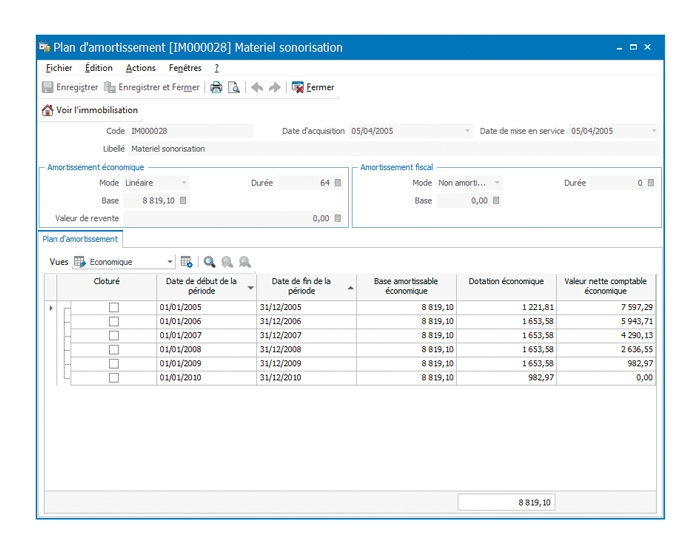 • Mode d'amortissement linéaire, dégressif, dégressif personnalisé et non amortissable